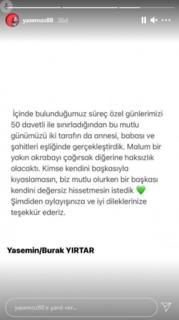 Kimse kendini başkasıyla kıyaslamasın, biz mutlu olurken bir başkası kendini değersiz hissetmesin istedik. Şimdiden anlayışınıza ve iyi dilekleriniz teşekkür ederiz" ifadelerini kullandı.