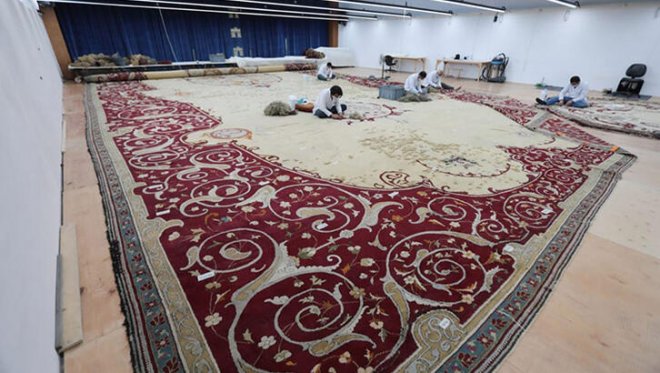 Bordürleri dışında 248 metrekare ile ‘Türkiye’nin en büyük yekpare dokuması’ olma özelliğini taşıyan halıda son olarak tesviye ve rötuş işlemleri gerçekleştirilecek. 3 ton ağırlığındaki tarihi halı, restorasyon işlemlerinin tamamlanmasının ardından ait olduğu tören salonunda sergilenmeye devam edecek.
