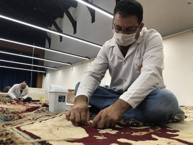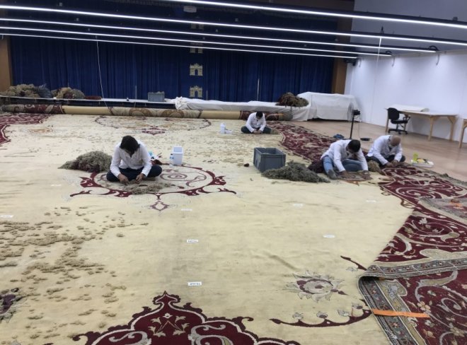 Konu ile ilgili açıklama yapan Milli Saraylar Halı Atölyesi Sorumlusu Mustafa Köksal, “Milli Sarayların envanterinde bulunan en büyük halımızın başındayız. Şu anda onarım işlemleri devam ediyor. Yüzde 70’lik kısmını tamamlamak üzereyiz. Yüzde 30 kalan kısmındaki çalışmalar devam ediyor. Biz bu halıyı 2018 yılında Yıldız Şale Köşkü’nden alarak çelik konstrüksiyon havuzda yıkadık. 6 ay gibi bir zaman içerisinde kuruttuk. Bakımlarını yaptıktan sonra bu mekana naklettik. Burada onarım çalışmaları devam etti. Şu anda yüzde 70’ini tamamladık. Kalan kısmını da 4-5 ay gibi bir zamanda tamamlayıp çalışmayı bitirmeyi tasarlıyoruz” dedi.