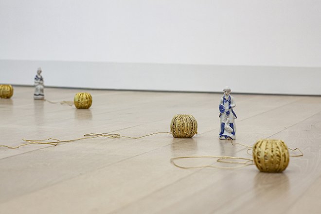 Formu, mekânı, zamanı ve bunlar arasındaki ilişkileri sıradışı bir malzeme çeşitliliğiyle araştırırken gündelik, öyküsel, hatta otobiyografik öğeleri de devreye sokan Onur, müziğe farklı duyuların dahil olduğu bir süreç olarak yaklaşır. Sanatçının Çiçekli Kontrpuan (1982), Kadans (1995), Opus I (1999), Prelüd (2000), Noktürn (2001) ve diğer pek çok yapıtında olduğu gibi, doğrudan müziksel referanslar taşıyan bu yerleştirmesinde, dört sıradan nesne birbirleriyle etkileşime girerek mekâna özgü bir kompozisyon kuruyorlar. Zemin üzerinde sırayla belirip birbirleriyle etkileşime geçen beyaz örgü şişleri, altın renkli ip yumakları, küçük porselen figürler ve standart müze kaidelerinin meydana getirdiği farklı formlar ve motifler, yer yer duraklamalar ve kreşendolarla çeşitlenerek çoğalırken, içinde yayıldıkları mekânı referans alıp onu yeniden düzenleyen görsel bir müzik oluşturuyorlar.