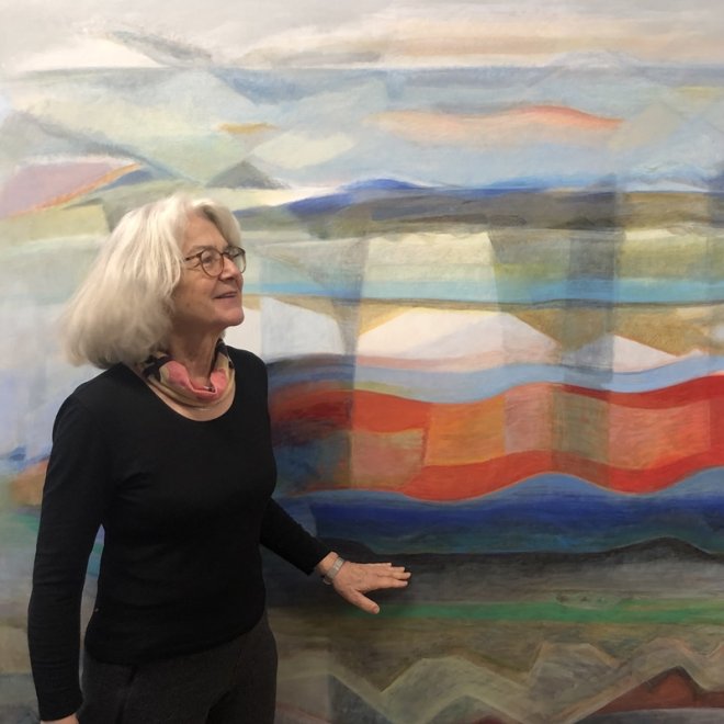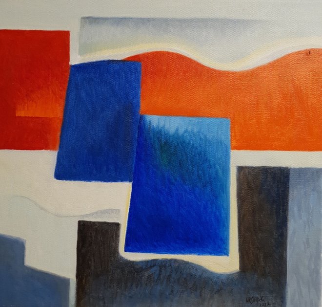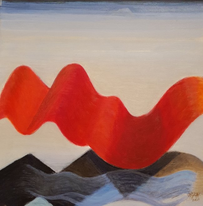 “Renk benim için her şeydir” diyen Ursula Soltermann Katipoğlu, sanatsal dilinin tuvale aktarımında her zaman için öncelikle renklerle düşünüp, sonrasında renklerin uyum ahenk ve zıtlığını, açık koyu dengelerini kurup formlarını ona göre yerleştirdiğini belirtiyor. Kendini bir anlamda peyzaj ressamı olarak adlandıran Ursula Soltermann Katipoğlu eserlerinin çoğunun soyut ve somut arasında ince bir çizgide dururken daha çok soyut olarak adlandırabileceğini söylüyor. Bu sergisinde İstanbul’da ve Türkiye’de yaşadığı otuz yılı aşan zaman diliminden ve özellikle son dört yılda eşi değerli ressam Yusuf Katipoğlu’nu kaybedip pandemiyi yaşadıktan sonra, içindekileri akıtarak yaşama bağlanmasının, umut etmesinin göstergesi olarak, yumuşak bir dalga formunda karşımıza çıkan kırmızı bantı yoğunlukla kullandığını belirtiyor. Sanatçı umudun göstergesi olarak kullandığı ‘Kırmızı Bant’ı adeta umut simgesine dönüştürüyor.