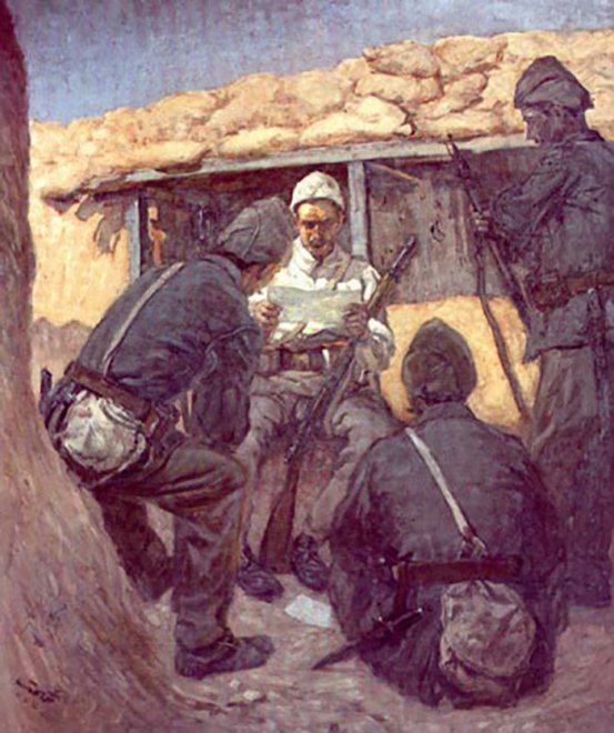 Türk Resim Sanatı'nın önde gelen izlenimci sanatçılarından olan Hikimet Onat, Kurtuluş Savaşı'na ait "Siperde Mektp Okuyan Askerler" ve "Savaşa Giderken" isimli kompozisyonları da gerçekleştirmiştir.