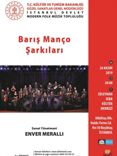 İstanbul Devlet Modern Folk Müzik Topluluğu, "Barış Manço Şarkıları" isimi konser ile Süleyman Seba Kültür Merkezi'nde 26 Kasım Salı günü saat 20:00'da sanatseverlerle buluşuyor.