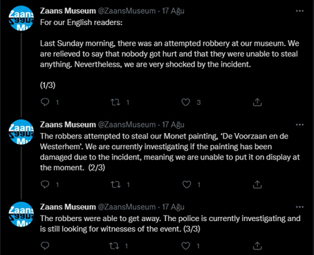 Zaans Müzesi’nden yapılan açıklamada, soyguncuların hiçbir şey çalamadığı belirtilirken, tablonun soygun girişimi sırasında hasar görüp görmediği yapılacak olan incelemelerin ardından netlik kazanacağı ifade edildi.