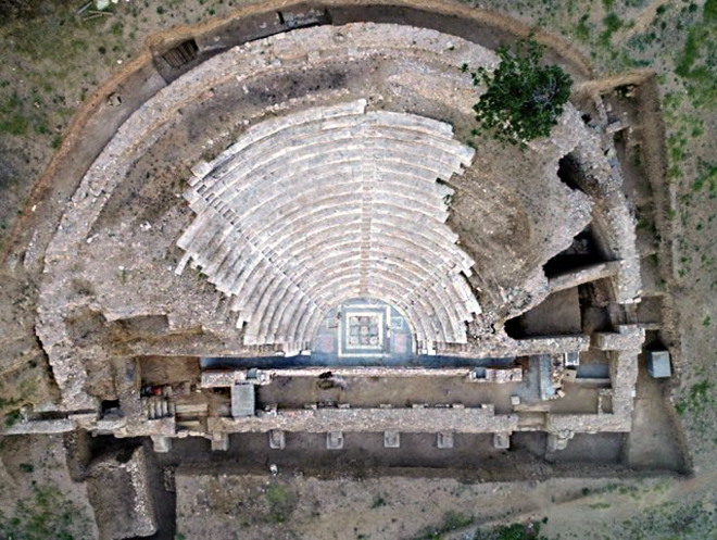 Sahne binasına çıkan merdivenlerin olduğu blokların üzerinde yer alan Gladyatör Graffitileri ve 3 arşitrav bloku üzerinde yer alan yazıt Tiyatronun Commodus döneminde Gladyatör döğüşlerine de ev sahipliği yaptığını göstermektedir. Günümüzde sadece sahne binasına ait kalıntıların yer aldığı tiyatroda kavea tamamıyle bitki örtüsü ile kaplıdır. Sahne binasının scaneafrons alınlıkarında Demeter’in kızı Persophoneyi araması mitolojisinin işlendiği ele geçen kalıntılardan anlaşılmaktadır.