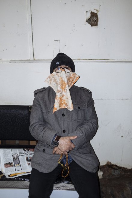 Emin Özmen: Eve yürürken, her zaman her koşulda o terkedilmiş binanın giriş katında oturmakta olan bir grup adamın yine aynı yerde sohbet ettiklerini görüyorum pencereden. Maske yerine kullandığı o bez parçası, elindeki tesbihi ile tam ortada oturan adam aniden dikkatimi çekiyor; kısa bir tereddüdün ardından, girip bir portresini çekiyorum.