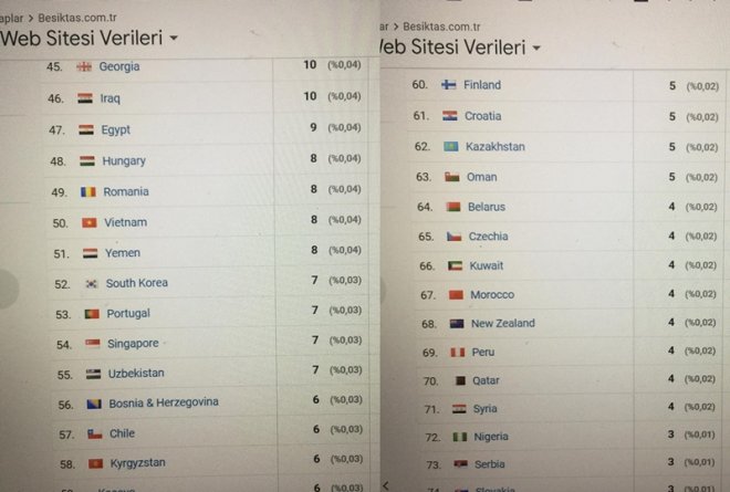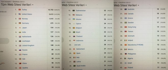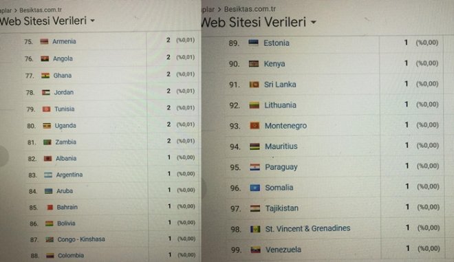 Dünyadaki 99 ülke Beşiktaş Medya Grup yayınlarını takip ediyor. Yapılan raporlamada görselde de görüldüğü üzere ülkelerin sıralaması sırasıyla şu şekilde: