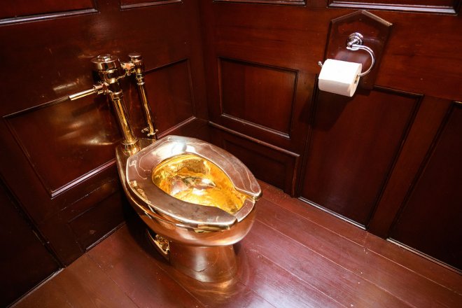 Muzu yerel bir meyve pazarında satın alan Cattelan, Amerika'da Guggenheim'e gelen ziyaretçileri kullanmaya teşvik ettiği tamamen işlevsel 18 ayar altın tuvaleti de dahil olmak üzere çizgi romanlarıyla tanınıyor. Tuvalet ise, yakın zamanda İngiltere’deki bir sergiden çalındı.