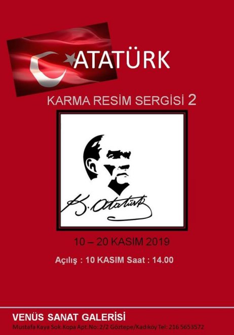Venüs Sanat Galerisi'nde, 10 Kasım Atatürk’ü anma günü etkinlikleri kapsamında “Atatürk Karma Resim Sergisi ” 10 Kasım tarihinde kapılarını ziyarete açıyor. Sergide usta ressamların suluboya, yağlıboya, karakalem ve pastel gibi farklı tekniklerde Atatürk çalışmaları yer almakta. Eserleri yer alan sanatçılar; Ahmet ÖĞRETEN, Bayram MUZ, Burhan ÖZER, Bülent KILIÇ, Celal GÜNAYDIN, Ender DİKMEN, Ercan PAYA, Ersin BURAK, Remzi İREN, Mehmet NECEFZADE, Natali AYDAR, Tariyel ALİZADE, Ziyad SULTANOV, Ayla YEŞİLMEN, Ayşe YAVUZDOĞAN, Dilek OĞUZ, Ilgın TOSUN, Kemal DERMAN, Mücella BALYEMEZ, Nedriye TOĞAN, Nilgün KURTULUŞ, Serdar ERSUN, Şenay SEYMEN.