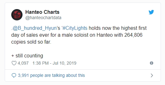 Ayrıca, EXO üyelerinin içinde solo albümü en çok satan Lay Zhang’ide geçti. İlk günde 260 bin’den fazla kopya sattığı için Baekhyun, Hanteo tarihinde bir erkek solo sanatçı için en yüksek ilk gün satışlarını da gerçekleştirdi.