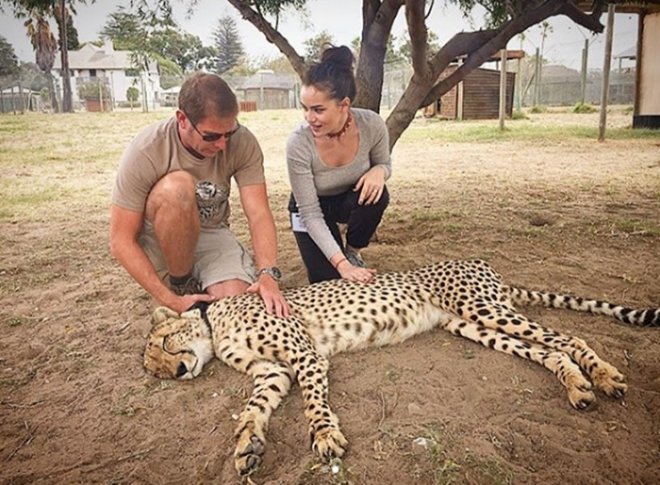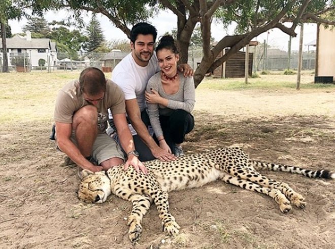 Güney Afrika’da bir hayvanat bahçesini ziyaret eden Fahriye Evcen ve Burak Özçivit, uyuyan bir çitayı severken çektirdikleri fotoğrafını paylaştı. Kısa sürede 400 binden fazla beğeni alan fotoğraf sosyal medyada büyük ilgi gördü. Hayvanat bahçesi görevlisinin kontrolünde olan çitayı severken hissettikleri mutluluk yüzünden okunan Fahriye Evcen ve Burak Özçivit, birlikte oldukları fotoğrafı paylaşarak sonunda takipçilerinin de yüzünü güldürdü.