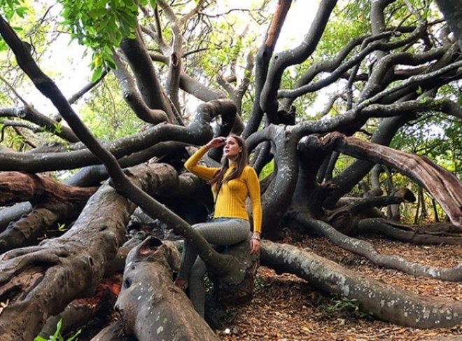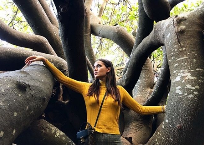 Güney Afrika seyahati boyunca gittiği yerlerde kıyafet seçimindeki parçaların model ve renkleri ile bulunduğu yerle de uyumlu olan Fahriye Evcen, makyajsız doğal güzelliği ile de dikkat çekiyor. Ağaç dallarının arasında bulunurken çekilen fotoğraflarında ise, sarı bluzu ve pantolonu ile ağacın gövdesi ve yaprakları arasındaki renk uyumunu yakalamış.