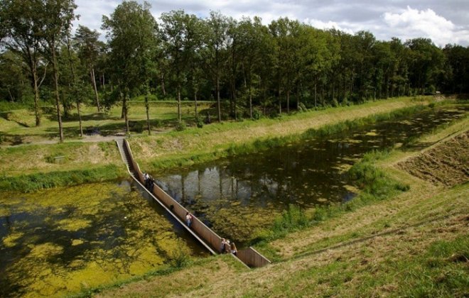 Denizi ayırarak, su yoluyla kalıcı bir yol inşa eden Ro & Ad Architects tarafından tasarlanan Moses Bridge, Hollanda’nın Kuzey Brabant kentindeki Halsteren köyünde bulunuyor. Her iki taraftaki hendeyi tutan su hattı, ön işlem görmüş ve çürümeye dayanıklı ahşaptan üretilmiş batık köprü, 17’inci yüzyıldan kalan bir kaleye erişimi sağlamak amacı ile tasarlanmıştır.