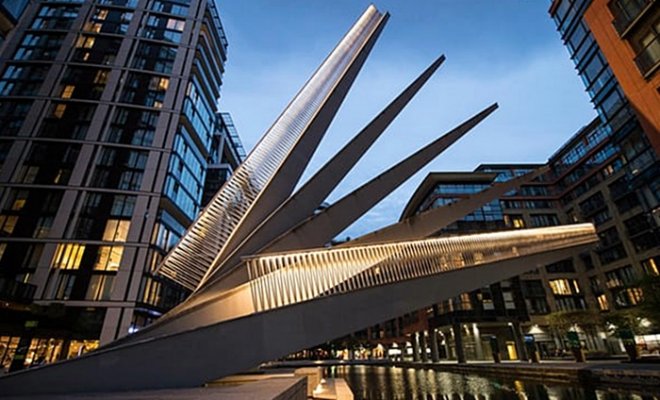 İngiltere’deki Rolling Bridge adlı köprü, Heatherwick Studio tarafından oluşturuldu ve 2004 yılında “heykel nesnesi” olarak kuruldu. Kanalın 12 metrelik bir geçitini oluşturmak için sekizgen yapısı bir taraftan açılıp kapanıyor.