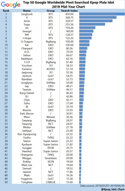 Google, 21 Ağustos’ta, 2019 yılının ortasında dünya çapında en çok aradan ilk 50 Kpop erkek idolü yayımladı. Allkpop’tan edinilen bilgilere göre; listenin başında BTS üyesi Jungkook, 450.00 arama indeksi ve ardından grup arkadaşları V ve Jimin geliyor. Tüm BTS üyeleri grafiğin ilk 10 sırasında yer alıyor.