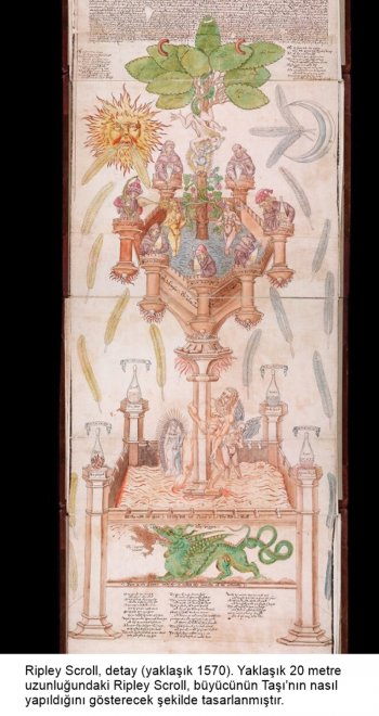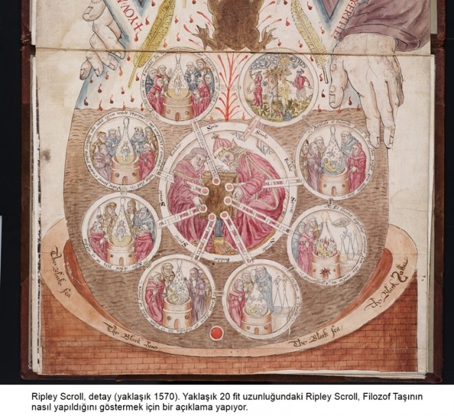 İngiltere gösterisindeki eserler dışında, tarihsel toplumun koleksiyonundan başka, etkileyici bir örnek olan Yale’in Ripley Scroll'u, sahibi üzerinde sonsuz bir servet ve sonsuz hayat bahşettiği söylenen efsanevi Büyücünün Taşını nasıl yaratacağına dair 20 metre uzunluğundaki resimli bir rehber yer alıyor.