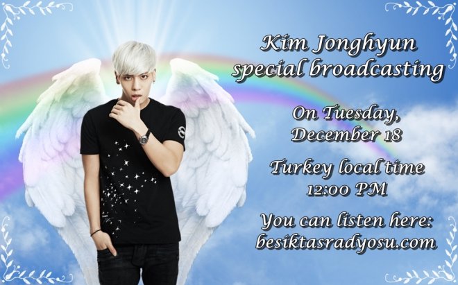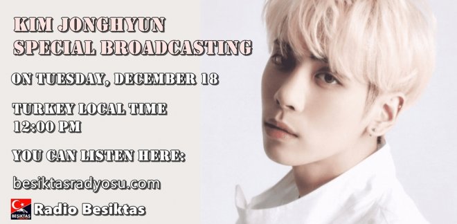 Kim Jonghyun’un anısına düzenlenecek olan özel yayında, 18 Aralık Salı günü saat 12:00'da sanatçı, seslendirdiği şarkılarıyla Radyo Beşiktaş’ta anılacak. “Kim Jonghyun Özel Yayını”nı “besiktasradyosu.com” adresinden dinleyebilirsiniz.