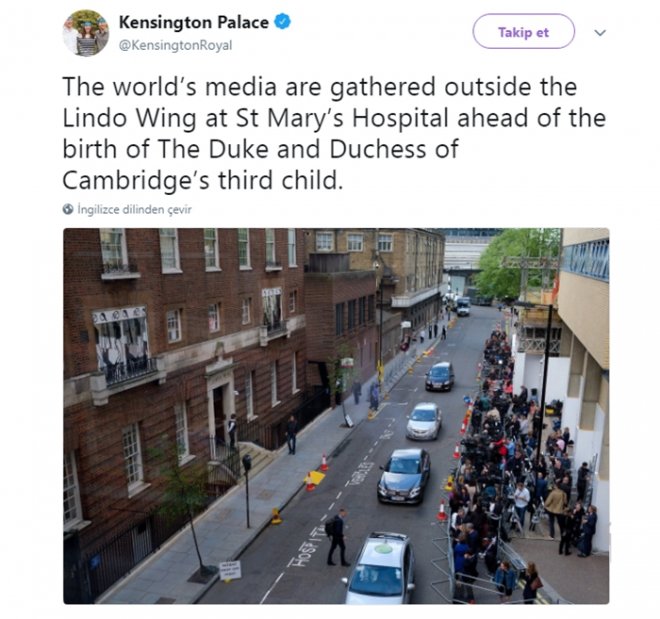 Kraliyet ailesi ve halkın heyecanla beklediği gün geldi. Kensington Palace, Kate Middleton'un Pazartesi sabahı Londra'daki St Mary's Hastanesine kabul edildiğini açıkladı. Kate Middleton’ın durumu hakkında Kensington Palace Twitter'dan yaptığı açıklamada, “Kraliyet Majesteleri Cambridge Düşesi, bu sabah erken saatlerde St. Mary's Hastanesi, Paddington, Londra'ya erken saatlerde kabul edildi. “Düşes, Kensington Sarayı'ndan Cambridge Dükü'nün bulunduğu St. Mary's Hastanesindeki Lindo Kanadı'na arabayla gitti.” İfadelerine yer verildi.