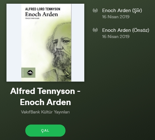 VakıfBank Kültür Yayınları tarafından Türkçe olarak yayımlanan ‘Kraliyet Şairi’ unvanlı İngiliz yazar Alfred Lord Tennyson’ın “Enoch Arden” adlı eseri, Spotify’daki yerini aldı. VakıfBank Kültür Yayınları’nın okurlara ve dinleyicilere sunduğu bu kitap, bindiği geminin kaza yapmasından sonra ıssız bir adaya düşen gemicinin trajik yaşamı ve karısına olan sonsuz aşk konu alınıyor.