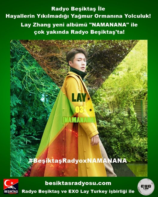 EXO grubunun Çinli üyesi LAY, yeni albümü “NAMANANA” ile1 Kasım Perşambe günü saat 15:00 - 16:00 arası Radyo Beşiktaş’ta dinleyiciler ile buluşacak. Radyo Beşiktaş ile EXO Lay Turkey işbirliği ile gerçekleştirilecek olan yayında, LAY’ın 3. albümü “NAMANANA”yı dinleyerek, “Hayallerin Yıkılmadığı Yağmur Ormanına Yolculuk” yapacağız.