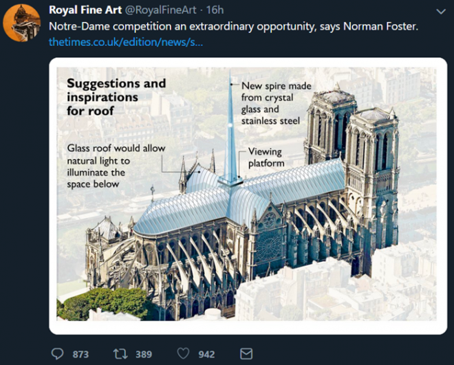 Fransa Cumhurbaşkanı Emmanuel Macron, Notre-Dame'ı daha da güzel bir hale getirecek çağdaş bir mimati jeste karşı olmadığını açıkladı. Fakat Fransa'daki pek çok kişi, Viollet-leDuc'un kulesinin sivri olarak aynı şekilde restore edilmesini istediğini söyledi.