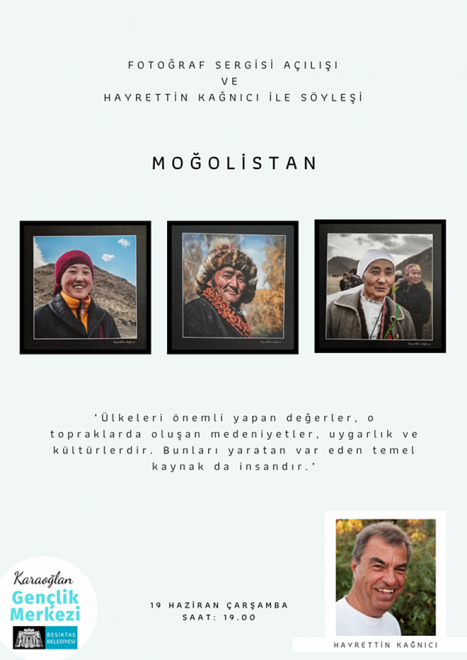 Fotoğrafçı Hayrettin Kağnıcı Orta Asya’nın yüzölçümü olarak en büyük ülkelerinden biri olan ve Cengiz Han’nın ülkesi olarak bilinen Moğolistan’nın gizemli kapılarını aralıyor. 19 Haziran Çarşamba günü Karaoğlan Kültür Merkezi’nde açılışı yapılacak olan ‘’Moğolistan’’ fotoğraf serginin ardından Kağnıcı fotoğraf severlerle söyleşi gerçekleştirerek bilgi ve deneyimlerini aktaracak.