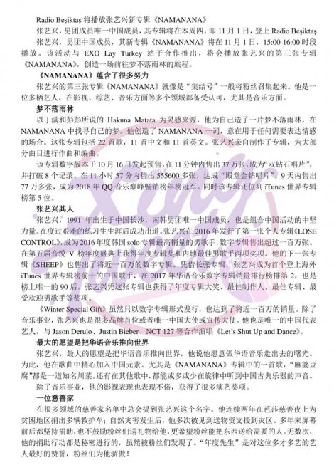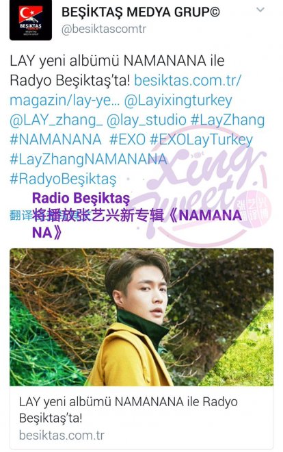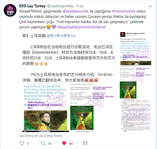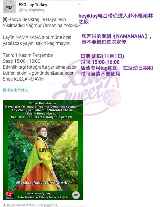 Sadece Lay Zhang ile ilgili haberleri Çince’ye çeviren bir fan hesabı olan Xing_tweetTRANS, 1 Kasım’da Radyo Beşiktaş’ın yapmış olduğu “Radyo Beşiktaş İle Hayallerin Yıkılmadığı Yağmur Ormanına Yolculuk!” adlı yayını Çince’ye çevirerek Weibo’da Çinli hayranlar ile paylaştı.
