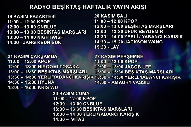 Radyo Beşiktaş’ta müzik dolu günler sizleri bekliyor. Birbirinden güzel ve farklı tarzlarda sanatçıların şarkılarından oluşan bu haftaki yayın programımızda, müziğin keyfini çıkaracaksınız. Radyo Beşiktaş ekibi tarafından hazırlanan yayın akışında bu hafta içi K-Pop, CNBLUE, Beşiktaş Marşları, Nightwish, Jang Keun Suk, Kris Wu, Hiroomi Tosaka, Ufuk Beydemir, Jackson Wang, Lay, Hyuna, Jacob Lee, Amaury Vassili ve Vitas’ın şarkılarını dinleyeceğiz.