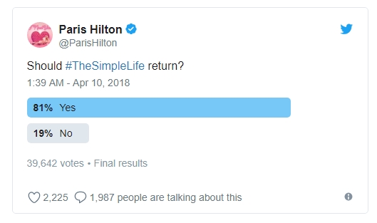 Hilton otellerinin mirasçısı Paris Hilton, geçen günlerde Twitter hesabından hayranlarına anket yaptı. 37 yaşındaki sosyoelit isim hayranlarına, yıllar önce en iyi arkadaşı Nicole Richie ile birlikte yer aldığı ‘The Simple Life’ adlı tv programının tekrar başlaması hakkında ne düşündüklerini sordu. Ekranlara geri dönmesini görmek isteyip istemedikleri hakkında hazırladığı ankette, “TheSimpleLife geri dönmeli mi?” diye sordu. Anketi oylayanların yüzde sekseni ‘Evet’ dedi.