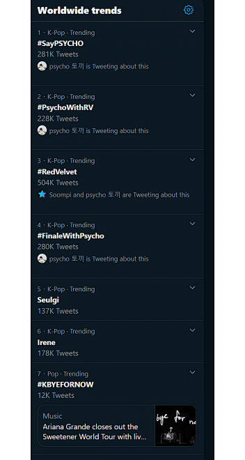 Güney Koreli kız müzik grubu Red Velvet'in yeni albümü “The ReVe Festival: Finale” yayınlandı. İlk müzik videoları “Psycho” isimli şarkı, başkalarının gözünde çılgınca göründükleri, ancak yine de birbirleri için amaçlandıkları kadar çok savaşan bir çiftin hikayesini anlatıyor. Öte yandan Red Velvet’in hayranları ReVeluv, #SayPSYCHO, #PsychoWithRV ve #RedVelvet de dahil olmak üzere geri dönüşlerini kutlarken Twitter'da birçok hashtag ile dünyaya dünya genelinde trend oldu.