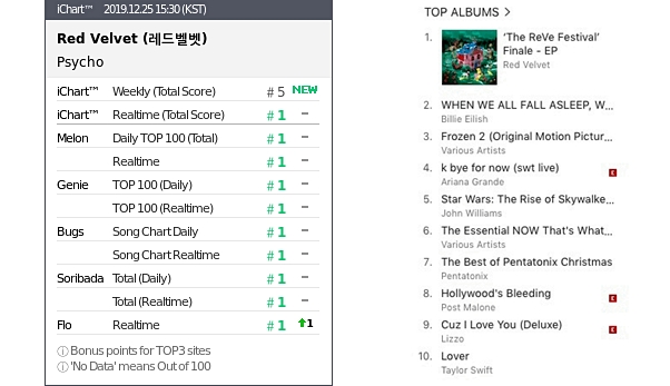 Red Velvet’in son başlık parçası “Psycho” tüm dünyada iTunes listelerini ele geçirdi. K-Pop kız grubu 23 Aralık'ta “The ReVe Festival: Finale” albümünü ve “Psycho” başlık parçasını yayınladı. Albüm, ABD, Kanada, Meksika, Brezilya, Arjantin, Şili, Peru, Dominik Cumhuriyeti, Panama, Costa Rice, El Salvador, Belize, Estonya, İsveç ve Polonya dahil 42 ülkede iTunes En İyi Albümleri listesinde yer aldı.