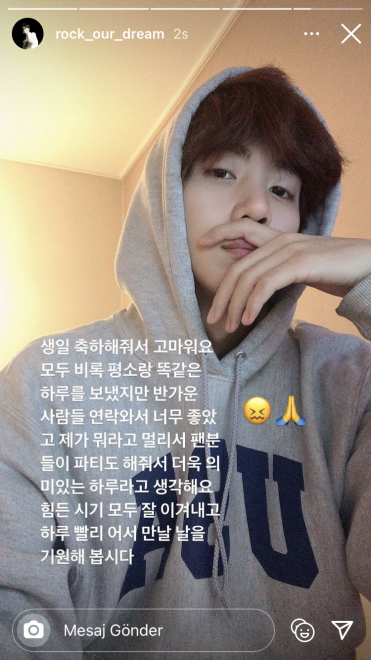 "Doğum günümü kutladığınız için teşekkür ederim. Herkes her zamanki gibi aynı günü yaşamasına rağmen, güzel insanların iletişime geçmesi çok güzeldi. Uzaktaki fanlar parti yaptığından daha da güzel bir gün olduğunu düşünüyorum. Zor zamanları aşıp yakında bir gün görüşmek dileğiyle..."