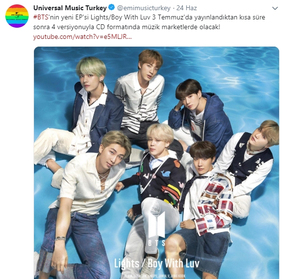 Dünya çapındaki Güney Koreli müzik grubu BTS’in yepyeni EP’si “Lights/Boy With Luv” 3 Temmuz’da yayınlanacak. Yayınlandıktan kısa süre sonra 4 versiyonu ile CD formatında müzik marketlerde yerini alacağını Universal Music Turkey, Twitter hesabında yaptığı paylaşım ile duyurdu.