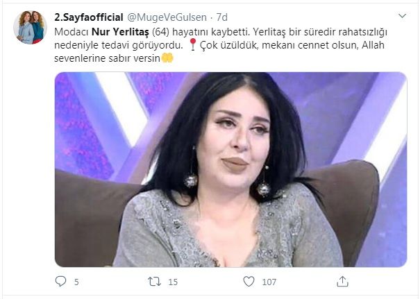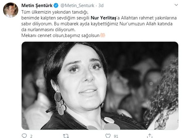 Geçtiğimiz yıl beyin ameliyatı olan modacı Nur Yerlitaş 64 yaşında hayata veda etti. Sanat camiasından ünlü isimler, Nur Yerlitaş'ın ölümünün ardından bu mesajları yayınladı. Medya Tava'dan edinilen bilgilere göre; ünlülerin modacısı Nur Yerlitaş'ın ölümü ünlüler camiasında üzüntüye neden oldu.