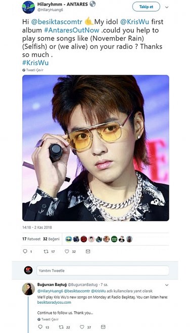 On Monday, November 5th we will listen to Kris Wu's popular songs and his new album Antares in Radyo Beşiktaş, with intense desire of Chinese singer Kris Wu's fans. You can listen to Kris Wu special broadcast from everywhere in the world.
