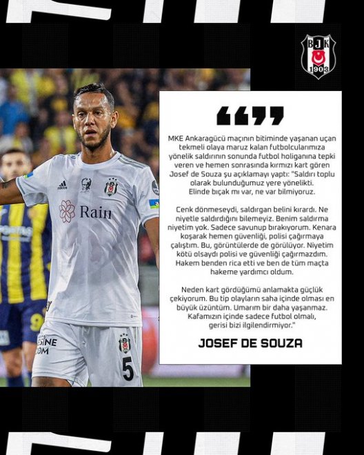 Duyguların ön plana çıktığı anlar yaşandı. Maçtan sonra Josef neden kırmızı kart gördü, anlamıyorum. Josef arkadaşlarını korumaya çalışıyordu. Taraftarın saldırısı, sonrasında Josef’in arkadaşlarını korumaya çalışırken kırmızı kart görmesi kabul edilemez. Rakibimizle Vodafone Park’ta da karşılaşacağız. O maçta taraftarlarımız bizimle olacak. Diğer konuları kendi içimizde konuşuruz ama bugün esas konu, bir taraftarın sahaya girerek oyuncularıma saldırması.”