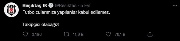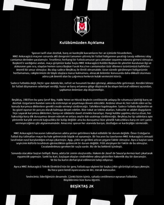 Sadece MKE Ankaragücü başkanını nazik davranışı ve Beşiktaş’ımızdan özür dilemesinden dolayı takdir ettiğimi söylemek isterim. Ayrıca Beşiktaş Jimnastik Kulübü hukuk bölümü, nerede, ne zaman, neye itiraz edeceğini çok iyi bilir. TFF Başkanı bizim müracaat etmediğimizi ifade etmiş. Prosedür gereği futbolcunun önce disiplin kuruluna sevk edilmesi, bizim de savunma vermemiz gerekiyor. Bizim aldığımız bilgi bu çerçevede. Durum bundan ibarettir. Artık bundan sonra bütün spor kulüplerinin; başkanlarının, yöneticilerinin, taraftarlarının, hocalarının ve futbolcularının futbol terörüne hizmet etmemeyi kendileri için bir amaç edinmeleri gerekiyor. Aksi halde bu gidişle sahada oynanan futbolu değil tribünlerde yapılan şaklabanlıkları seyrederek Türk futboluna zarar vermeye devam edeceğiz.