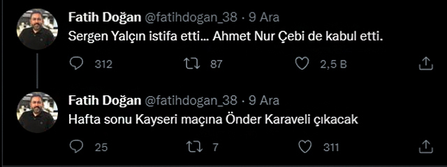 Usta spor yazarı Fatih Doğan, Sergen Yalçın'ın Beşiktaş'taki teknik direktörlük görevinden istifa etmesinden sonra, Twitter hesabında konu hakkında paylaşımlarda bulundu.