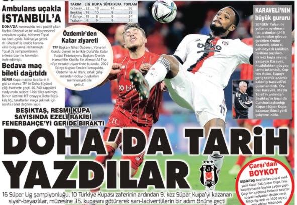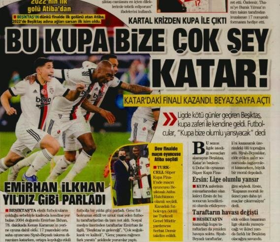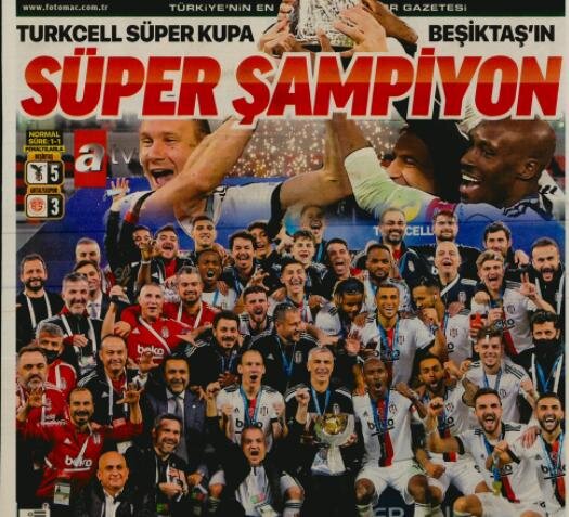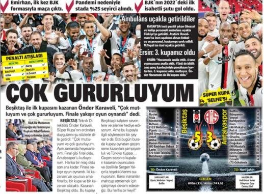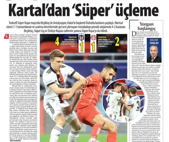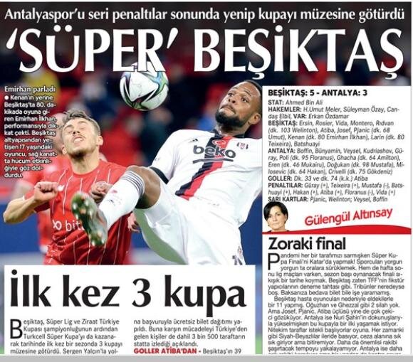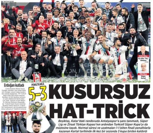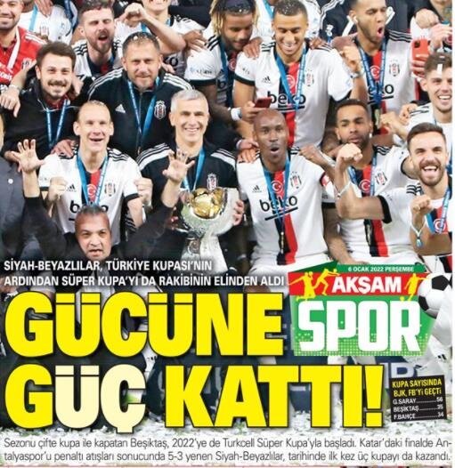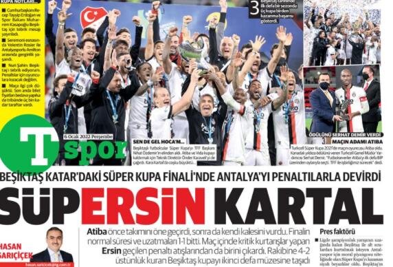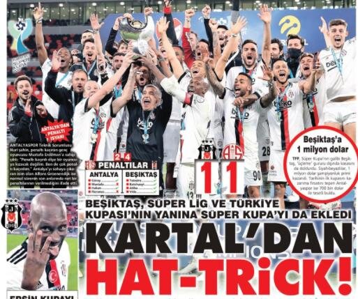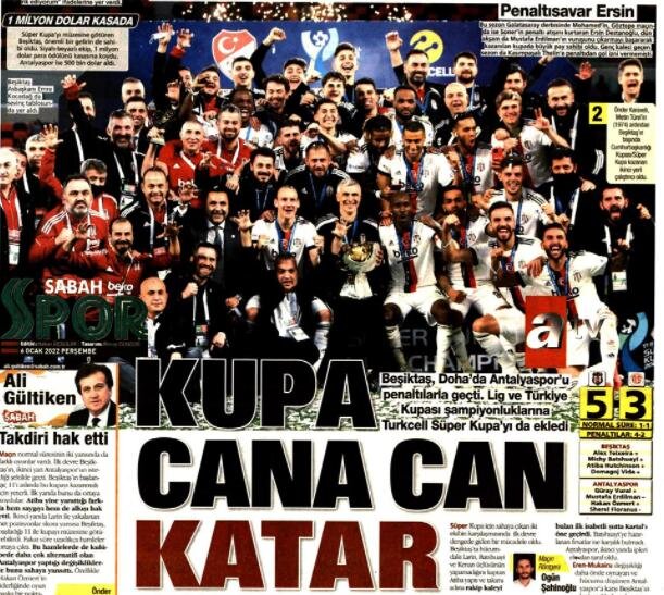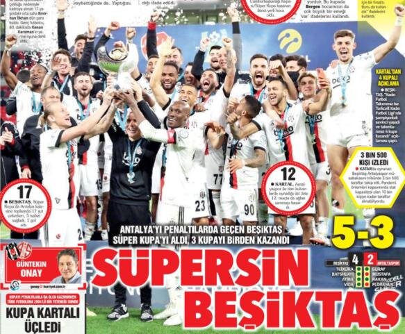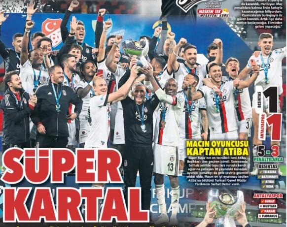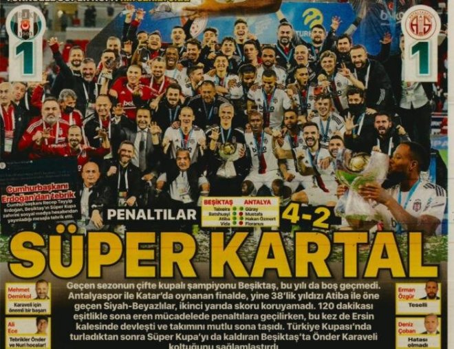 Katar’da düzenlenen Turkcell Süper Kupa’da Fraport TAV Antalyaspor’u penaltı vuruşlarının ardından toplamda 5-3’lük skorla yenerek şampiyon olan Beşiktaş'ın gazetelerdeki spor manşetlerini derledik.