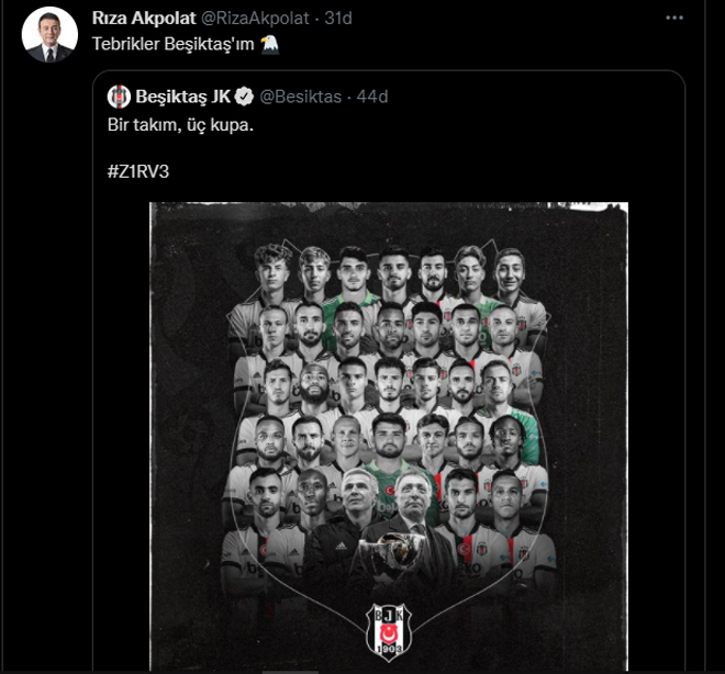 Beşiktaş Belediye Başkanı Rıza Akpolat, "Tebrikler Beşiktaş'ım" ifadelerine yer verdi.