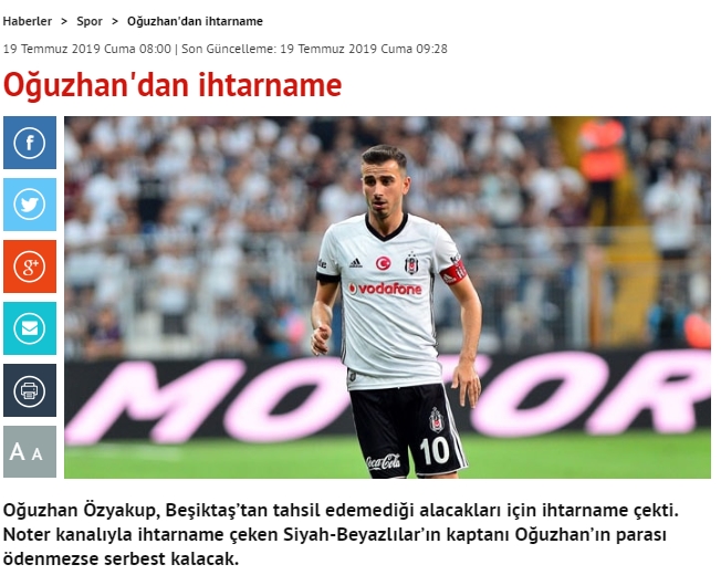 Akşam Gazetesi’nde yazan haberde Oğuzhan Özyakup’un tahsil edemediği alacakları için Beşiktaş’a ihtarname çektiği ve parası ödenmezse futbolcunun serbest kalacağını ileri sürüldü. Bu haber üzerine Beşiktaş Jimnastik Kulübü, resmi web sitesinde açıklama yaparak, haberde yazanların doğru olmadığını bildirdi. İşte Beşiktaş JK’nin açıklaması: