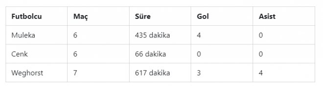 Beşiktaş’ın süre alacak üç forveti de farklı özellikte. Valerien İsmael üç oyuncuyu da farklı şekilde kullanıyor. Weghorst takımın 1 numaralı hücum gücü. 1.97'lik boyu ve hareketli tarzıyla Hollandalı, hem al-ver yapıyor hem alan açıyor hem de uzun topları indiriyor. Üç golüne eklediği dört asistle derbide özel bir performans gösterebilir. Muleka ise ikinci santrfor görevinde ve açılan boş alanlarda etkili oluyor. Onun dört golünün üçü kafa vuruşlarıyla geldi. Cenk Tosun ise bu sezon suskun. Onun da 13 kez rakip olduğu Fenerbahçe'ye golü bulunmuyor.
