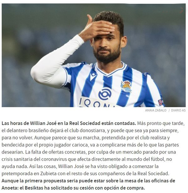 Fotomaç'ta yer alan iddialarda, Real Sociedad'ın, Willian Jose için yaklaşık 15 milyon Euro bonsevis bedeli talep ettiği belirtildi. Bu ücreti herhangi bir kulübün ödemeye yanaşmadığı, masadaki en ciddi teklifin siyah beyazlılardan geldiği aktarıldı. 29 yaşındaki futbolcunun Real Sociedad ile 2024 yılına kadar sözleşmesi bulunuyor. Willian Jose, geçen sezonun ikinci yarısında Premier Lig takımlarından Wolverhampton'da kiralık olarak forma giymişti.