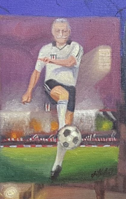 Beşiktaş JK Müzesi’nde bulunan Süleyman Seba’ya adadığı “Beşiktaşlılık Duruşunun Ölümsüz Sembolü” isimli tablosunu tablo içine yerleştiren ressam, bu şekilde iki tabloyu aynı karede resmetmiş olduğunu söylüyor.