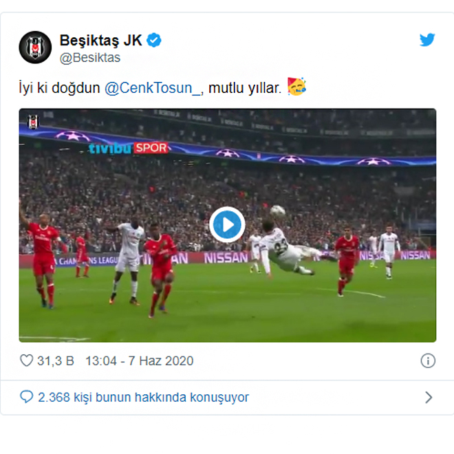 Beşiktaş, Premier Lig’de Everton forması giyen eski futbolcusu Cenk Tosun’un doğum gününü kutladı. Siyah-beyazlıların resmi Twitter hesabı, 29 yaşına giren milli futbolcunun Şampiyonlar Ligi’nde 3-0’dan 3-3’e gelen maçta attığı şık golü paylaştı.