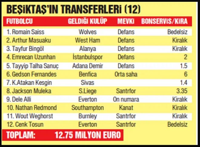 12 futbolcu alan Beşiktaş’ın Dele Alli’yi kiralık olarak renklerine bağlaması tüm dünya için büyük sürpriz oldu. Kartal’da bu dönemin diğer önemli notu, kadroya katılan 11 futbolcunun 6’sının İngiltere Premier Ligi’nden (Cenk Tosun, Weghorst, Saiss, Dele Alli, Redmond, Masuaku) gelmiş olmasıydı.