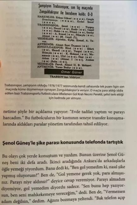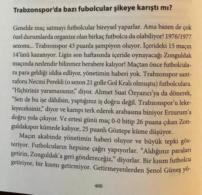 "Genelde maç satmayı futbolcular bireysel yaparlar. Ama bazen de çok özel durumlarda organize olan birkaç futbolcu da olabiliyor! 1976-1977 sezonu... Trabzonspor 43 puanla şampiyon oluyor. İçerideki 15 maçın 14'ünü kazanıyor. Ligin son haftasında içeride oynayacağı Zonguldak maçında nedendir bilinmez berabere kalıyor! Maçtan önce futbolculara para geldiği iddia ediliyor, yönetimin haberi yok. Trabzonspor santraforu Necmi Perekli (o sezon 21 golle Gol Kralı olmuştu) futbolculara. "Hiçbiriniz yaramazsınız," diyor. Ahmet Suat Özyazıcı'ya dönerek, "Sen de bu işe dâhilsin, yaptığınız iş doğru değil. Trabzonspor'u lekeleyeceksiniz" diyor ve kampı terk ederek arabasına biniyor Erzurum'a doğru yola çıkıyor. Ve ertesi günü maç 0-0 bitince 26 puana çıkan Zongludakspor kümede kalıyor, 25 puanlı Göztepe küme düşüyor."