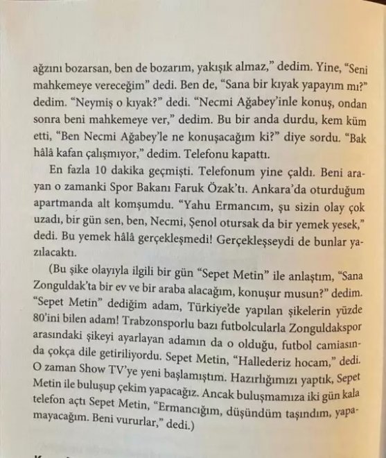 "Beni arayan o zamanki Spor Bakanı Faruk Özak'tı. Ankara'da oturduğum apartmanda alt komşumdu. "Yahu Ermancım, şu sizin olay çok uzadı, bir gün sen, ben, Necmi, Şenol otursak da bir yemek yesek," dedi. Bu yemek hala gerçekleşmedi! Gerçekleşseydi de bunlar yazılacaktı."