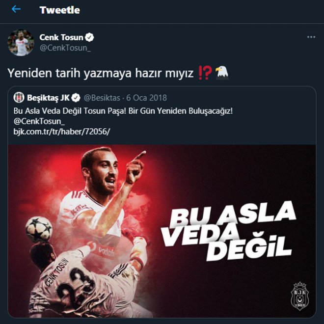 Beşiktaş'a dönecek olan Cenk Tosun, Twitter hesabından "Yeniden tarih yazmaya hazır mıyız?" şeklinde paylaşımda bulundu.