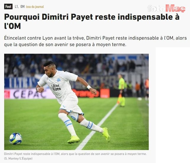 Fransız gazetesi, Olymqpiue Marsilya'da bu sezon düzenli forma şansı bulamayan ve 4 maçlık cezadan dönen Dimitri Payet'in takımdan gönderilmek istendiğini yazdı. Tecrübeli futbolcuyla ilgilenen takımlar içerisinde Türk kulüplerinin olduğunu iddia eden gazete ayrıca Beşiktaş'ın adını vererek, siyah-beyazlıların orta saha oyuncusunu transfer etmek isteyen en ciddi kulüp olduğunu bildirdi. Marsilya'da oynadığı maçlarda başarılı performanslara imza atan yıldız ismin aylık brüt 600 bin Euro kazanması, takımdan gönderilmek istenmesindeki en büyük faktör olarak yorumlandı. Ayrıca Payet'in sezon sonunda 33 yaşına girecek olması da bir başka neden olarak gösterildi.